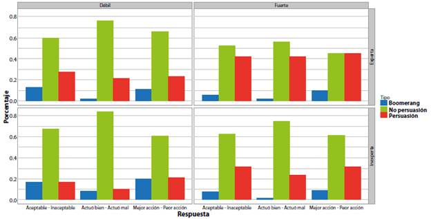 El mensaje persuasivo siempre fue contraactitudinal: los participantes que dieron un juicio moral reprobatorio en el premensaje recibieron un argumento a favor de la decisión del personero, mientras que quienes dieron un juicio moral aprobatorio en el premensaje recibieron un argumento en contra de la decisión del personero. De esta manera, si alguien recibió un argumento a favor, el nivel de persuasión consiste en la disminución de la reprobación, mientras que, si alguien recibió un argumento en contra, la medida de persuasión consiste en la disminución de la aprobación. Para analizar en conjunto los datos de ambos casos, se invirtieron los datos de quienes recibieron argumentos a favor. Con esta inversión siempre hubo más persuasión cuanto más hubiera disminuido la magnitud en la respuesta en el juicio posmensaje con respecto al juicio premensaje.