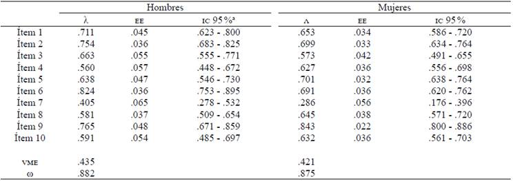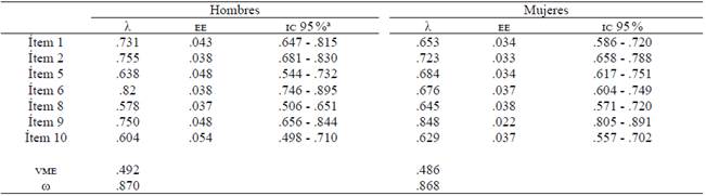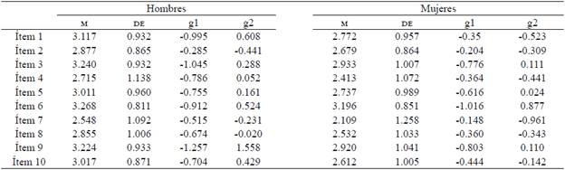 Los indicadores de asimetría y curtosis de todos los ítems no exceden los límites establecidos (ver Tabla 1). Así mismo, no existió un alejamiento significativo de la normalidad multivariada en hombres y mujeres (G2hombres = 22.940; G2mujeres = 21.574) en la versión de 10 ítems, así como en la de siete ítems (G2 hombres = 17.944; G2 mujeres = 13.977).