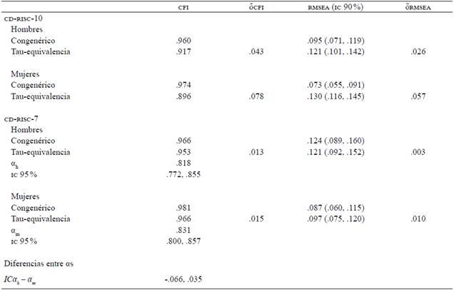 La evaluación de la tau-equivalencia en la CD-RISC-10 no fue favorable, dado que la variación en los índices de ajuste fue muy elevada (Tabla 5). Sin embargo, la CD-RISC-7 recibió mejores indicadores, por lo que se puede aceptar que las cargas factoriales son estadísticamente similares, haciendo factible la estimación del coeficiente a. Por último, este coeficiente no difiere significativamente entre hombres y mujeres en vista que el IC incluye al cero (Tabla 5).