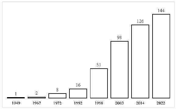 El número de programas académicos para la formación de psicólogos en Colombia ha ampliado su oferta de manera significativa. Así, mientras que en 1973 había solo tres programas, en la actualidad se registran 144 programas de psicología activos (véase Figura 1 ) (SNIES, fecha de consulta junio 2022), ofrecidos por 74 instituciones de educación superior (IES). Respecto a estos programas se pueden hacer las siguientes consideraciones: 26 programas se ubican en el sector oficial (18 %) y 118 en el sector privado (82 %); 42 de estos programas son ofertados por instituciones universitarias o escuelas tecnológicas (29%) y 102 por universidades (71%); 50 tienen acreditación de alta calidad (35%) y 94 cuentan con registro calificado (65%); 132 programas se ofrecen bajo la modalidad presencial (92%), 8 programas virtuales1 (5.5 %) y 4 a distancia (2.5 %).