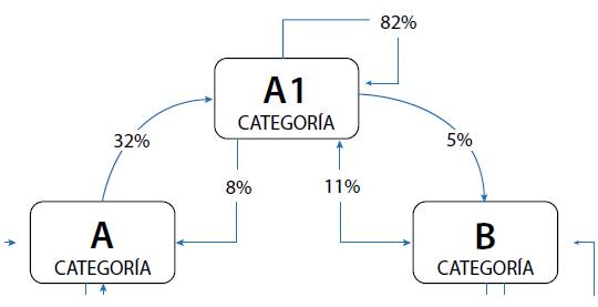 En el 2011 solo un grupo de psicología ostentaba la categoría A1 y en el 2021 -según los resultados preliminares de la convocatoria 894-, hay 37 grupos en esta categoría. Con este resultado los Grupos A1 ponen en lo más alto el listón (25.9 %), por encima de su clasificación histórica. Un análisis revela que 82 % de los grupos de psicología clasificados A1 en la convocatoria 833 del 2018, conservaron su categoría A1 en la convocatoria 894 del 2021 -última convocatoria realizada por Minciencias en Colombia-. Además, 32 % de los Grupos A ascendieron a A1 y 50 % de ellos conservaron su categoría. A su vez, 11 % de Grupos B ascendieron a A1 y 38 % a la categoría A, mientras que 44 % se mantuvieron en su clasificación. De hecho, los Grupos C presentan similar tendencia de cambio, 43 % de ascenso: 6 % pasan a A1 y A, 31 % de estos pasan a B y 48 % permanecen en su misma categoría (Figura 2).