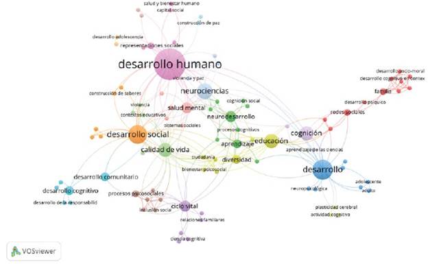 La Figura 3 presenta un mapa de conceptos obtenidos a partir de las líneas de investigación de 44 grupos que declaran un compromiso con el estudio del desarrollo (véase Anexo A).