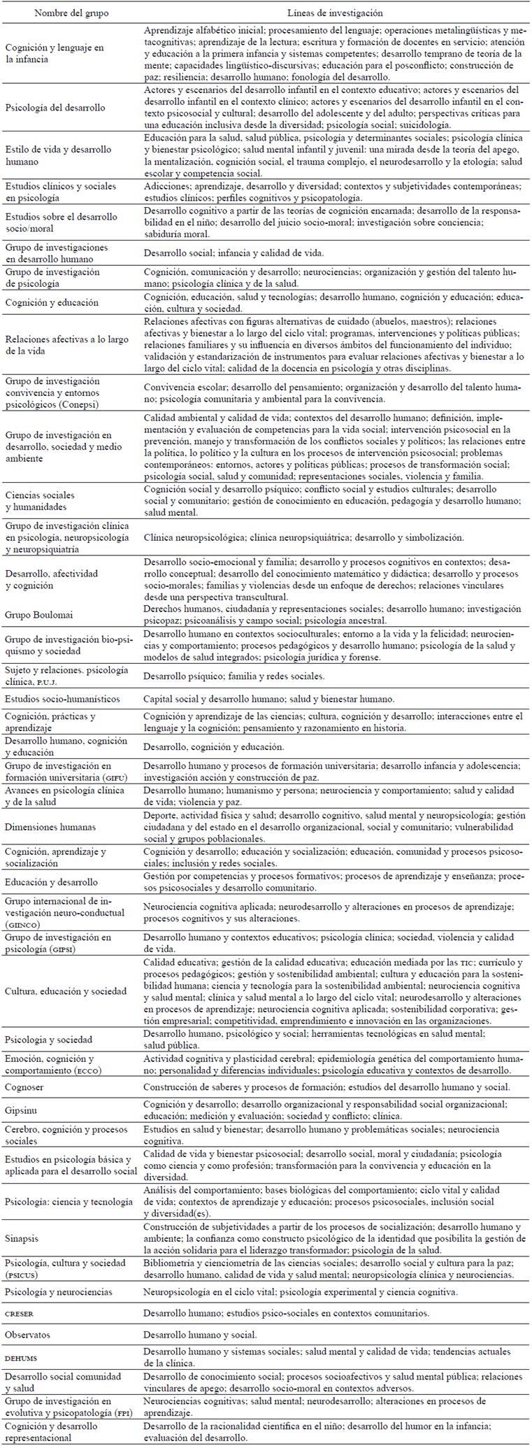 En primer lugar, mediante la plataforma Scienn2 se identificaron los grupos de investigación en psicología reconocidos/categorizados en Colombia, que reportan en sus líneas de investigación temáticas o dominios relativos al desarrollo en los diferentes momentos del ciclo vital. Dado el elevado número de grupos que arrojó la primer búsqueda, se aplicó como segundo criterio de selección la continuidad en la producción y el número de productos, de esta manera, se tuvieron en cuenta grupos cuyos investigadores mostraran una producción de más de diez años, con un mínimo de diez publicaciones. Los grupos que no cumplieron estos criterios fueron incluidos en una sección más corta disponible en los anexos de este documento.