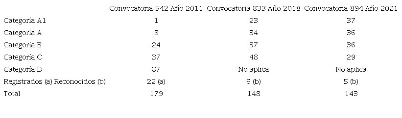 El segundo indicador es el surgimiento de grupos de investigación registrados en la plataforma ScienTI. En el transcurso de 10 años, se observan cambios importantes en la clasificación de los grupos de investigación (Tabla 1).