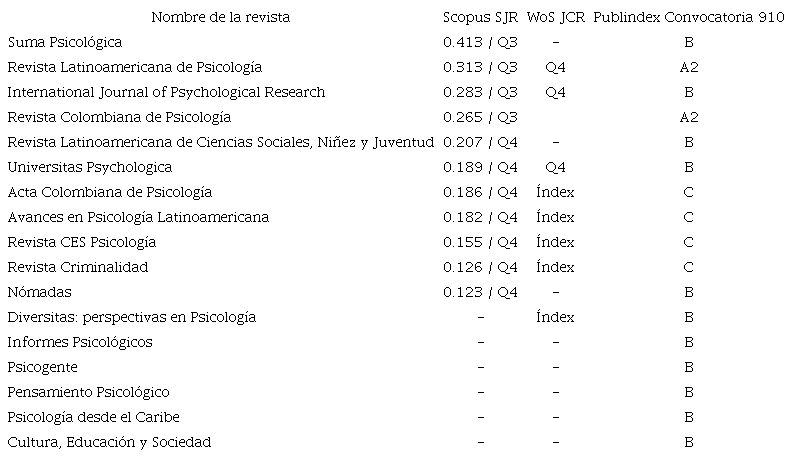 Otro indicador del posicionamiento de la psicología en Colombia se observa en la presencia de revistas de psicología en el Scimago Journal Rank (SJR). En la actualidad hay 11 revistas indexadas de un total de 46, pertenecientes a este campo de conocimiento en Latinoamérica. Se destaca que cuatro revistas colombianas son las que tienen mayor impacto en la región según el SJR-2021: Suma Psicológica (SJR = 0.413), Revista Latinoamericana de Psicología (SJR = 0.313), International Journal of Psychological Research (SJR = 0.283) y Revista Colombiana de Psicología (SJR = 0.265). Es relevante, además, el resultado de la convocatoria 910 realizada por Publindex en el 2021, en el cual son clasificadas 17 revistas de psicología en Colombia, teniendo en cuenta su periodicidad y calidad de la gestión editorial, así como la visibilidad y el impacto de los artículos publicados (con vigencia hasta el 2022).