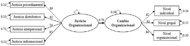 Continuando con una descripción deductiva, que procura identificar los elementos que se relacionan en esta dinámica, se puede indicar que cada uno de los grandes elementos: justicia organizacional y cambio organizacional predicen de forma adecuada el comportamiento de sus componentes. Sin embargo, se observa que en dos de ellos (justicia procedimental y nivel individual total del cambio organizacional) la predicción no es directa y parecen estar relacionados con variables o contingencias individuales que responden a posibles elementos de incertidumbre por el escenario de la pandemia (Rentería-Pérez & Díaz-Bambula, 2020).