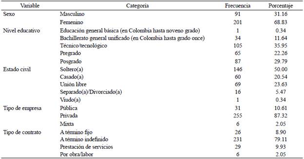 Una vez recolectados los datos (342 registros), 50 participantes fueron descartados porque 34 no aceptaron hacer parte de la investigación y 16 no completaron el formulario. Finalmente, así se conformó una muestra de 292 participantes. La edad promedio de la población fue de 34.21 años (DE = 10.45; con un rango entre 19 y 66 años), quienes reportaron un promedio de 4.89 años de vinculación laboral con la empresa (DE=6.27; con un rango entre 0 y 37 años). En la Tabla 1 se observan los valores de frecuencia y porcentuales de la muestra obtenida. La muestra se conformó principalmente por un 68.83 % de mujeres; con estudios superiores técnicos, pregrado y posgrado (88.01 %); solteros y casados (70.54 %); que laboran en empresas privadas (87.32 %), y el tipo de contrato que predominó fue a término indefinido (79.11 %).