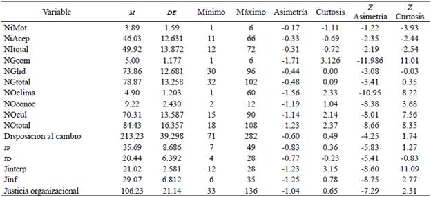 Se inició con un análisis descriptivo de los datos obtenidos. En la Tabla 2 aparecen los valores de dispersión y tendencia central de las variables del estudio. Los valores de referencia se tomaron a partir de los puntos de corte de Kim (2013), en el que valores Z superiores a 3.29 en muestras medias entre 50 y 300, indican un nivel alfa de 0.05 y rechaza la prueba de distribución normal. Según lo anterior, se encontró que las variables de interés del estudio presentaron distribuciones no normales, excepto las variables del nivel individual total y aceptación, y el nivel grupal en liderazgo.