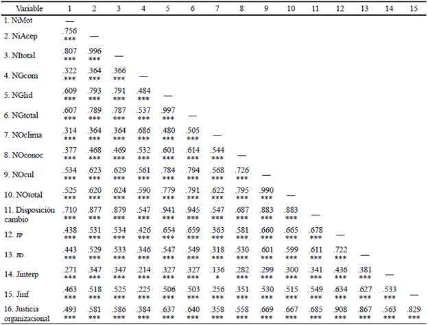 Ahora bien, al realizar un análisis pormenorizado de los contenidos de la Tabla 3, se encuentran los siguientes datos que ayudan a comprender un poco mejor el fenómeno de la figuración del cambio a razón de la justicia: (a) nivel individual -justicia organizacional total y NI total (.586)- y (b) nivel común -(1) justicia organizacional y NG total (.640), (2) justicia organizacional y NO total (.667), y (3) justicia organizacional y cambio organizacional (.685)-.