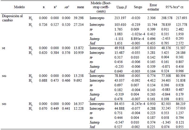 A partir de las correlaciones bivariadas obtenidas, se plantearon modelos de regresión para cada una de las dimensiones de la disposición al cambio y el valor total (variables criterio), y se usaron las dimensiones de justicia organizacional: procedimental, distributiva, interpersonal e informacional, como predictores en cada modelo. Se utilizaron coeficientes no estandarizados ß con simulaciones de Bootstrap (n = 5.000), recomendados para la corrección en los coeficientes derivados de muestras con anomalías en la distribución normal en las regresiones lineales múltiples (Eck, 2018).