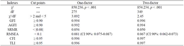 As noted in Table 1, both the one-factor and the two-factor models based on the present study's data provided good fit indexes. The two-factor model showed slightly better fit indexes when compared to the one-factor solution. An adequate x2/df ratio was found with the sample for both factorial solutions, which was not obtained by Henklain et al. (in press). To better investigate which model is the best, the assessment of closeness to unidimensionality was performed by adopting the cut-off points suggested by Damásio and Dutra (2017).