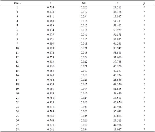 The one-factor solution fit indexes were adequate, and this solution is theoretically reasonable. It has been recommended by Keeley et al. (2006) and Henklain et al. (in press). As the evidence from the closeness to unidimensionality assessment suggests that the TBC is essentially unidimensional, it was decided to use the one-factor solution to analyze this paper's data. Nonetheless, Tables 2 and 3 show the lambda values, standard errors, z-scores, and p-values for the 28 TBC items organized into one and two-factors solutions.