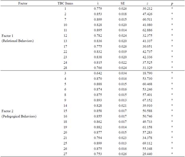 In this line of psychometric research, two investigations were especially significant for using the TBC as an instrument for measuring teacher performance. The first research, conducted by Keeley et al. (2006) in the USA, investigated the factor structure of the TBC in two studies. In Study 1, an Exploratory Factor Analysis (EFA) found two-factors: "Care and Support" and "Professional competence and communication skills". Then, in Study 2, the factor model, proposed at the end of the first study, was supported by a Confirmatory Factor Analysis (CFA) with a new sample, and a one-factor model. The test-retest reliability of the TBC between the middle and the end of the semester was favorable to the instrument used to evaluate teachers' performance.