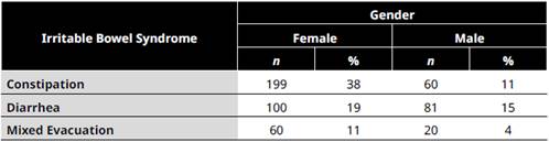 The descriptive analysis of IBS showed that 70% (520) had IBS and reported the following symptoms: constipation 49% (259), diarrhea 34% (181) and mixed types 15% (80). Female students showed greater frequency (38%) than did the males (Table 1).