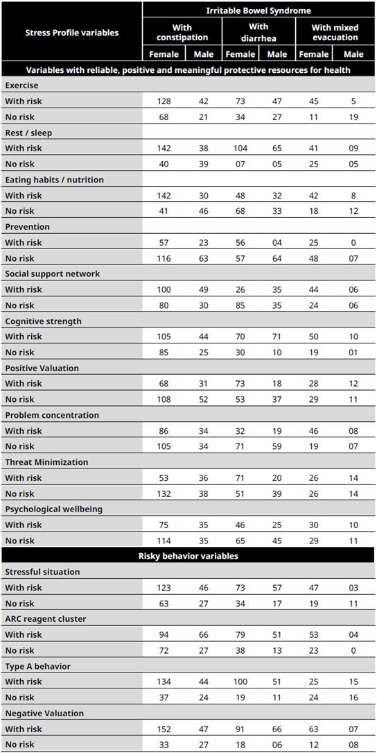 On the other hand, the SP variables considered risky behavior with IBS frequency and that posed a risky situation were: stressful situations 67% (349), ARC reagent cluster 66% (347), type A behavior 75% (389) and negative valuation 80% (416). Table 2 shows the distribution of each IBS type and each gender.