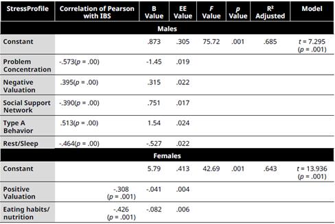The first model indicated that the SP variables of problem concentration, negative valuation, social support network, type A behavior and rest/sleep were IBS predictors in males, as follows: IBS = - 1.454 (problem concentration) + .315 (negative valuation) - .390 (social support network) + .513 (type A behavior) - .464 (rest/sleep), with a strength of 68.5% (F= 75.72; p =.001).