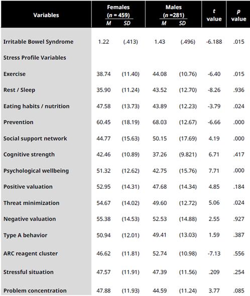 The comparative results of variables showed a higher means among males were IBS, exercise, prevention and social support network. Females, on the other hand, showed a higher mean in eating habits, psychological wellbeing and threat minimization. This study showed that males score higher on stress-related variables than females regarding the relation between the areas of lack of rest and sleeping well, bad eating habits and the lack of a social or family support network, with IBS. The reference works we found (Armenta et al., 2020; Park et al., 2015; Suardiaz-Murom et al., 2020; Torales et al., 2018; Zeledón et al., 2021), showed that the female gender has less probability of suffering from IBS than males, a discrepancy with other studies indicating that females are more susceptible to this disorder.