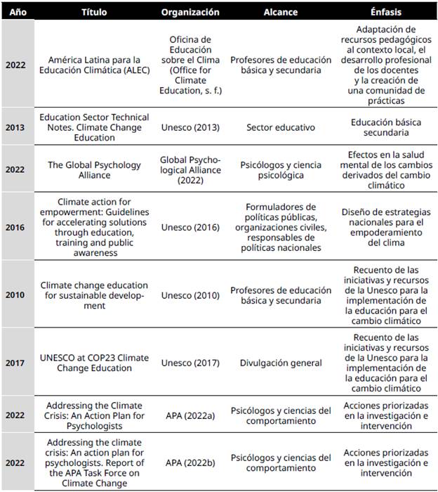 Se buscó información relacionada con el tema a partir de los documentos guía de la educación ambiental y para el cambio climático de la Unesco y las declaraciones de la Asociación de Psicología Americana (APA), los cuales fueron escogidos, primero, dada la preeminencia de la Unesco como división de la Organización de las Naciones Unidas para asuntos culturales y de educación, así como por ser el promotor multilateral de la articulación de los sistemas de la educación; y, segundo, el de la APA, por ser la asociación profesional de psicólogos más importante del mundo. A partir de esto, en la Tabla 1 se pueden observar los documentos escogidos para el análisis, donde se encuentran declaraciones de organizaciones como la Oficina de Educación sobre el Clima, la Unesco, la Global Psychological Alliance y la APA.