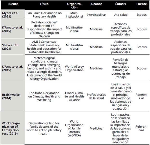 A partir de lo encontrado, se puede afirmar que la cantidad de declaraciones de asociaciones profesionales publicadas en fuentes académicas es escasa, y que las que hay están concentradas temáticamente en el impacto del cambio climático en la salud, incluso en el caso de asociaciones de disciplinas que no son exclusivamente de dicha área, como ocurre con la declaración de la Global Psychological Alliance (2022).