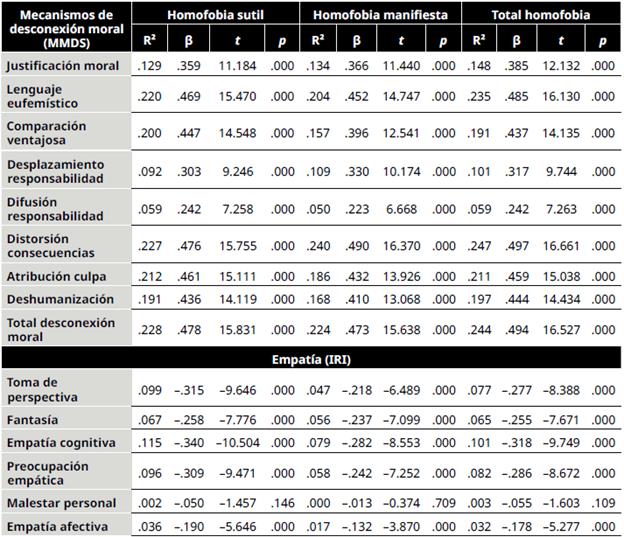 Los resultados indican que los mecanismos de desconexión moral permiten predecir significativamente actitudes homófobas sutiles y manifiestas. Especificamente, en la escala total de homofobia, la justificación moral de los jóvenes estudiantes explica el 14.8 % de la varianza de respuestas en homofobia (β = .385; p < .001); el lenguaje eufemistico explica el 23.5 % (β = .485; p < .001); la comparación ventajosa predice el 19.1 % (β = .437; p < .001); el desplazamiento de responsabilidad, el 10.1 % (β = ,317; p < .001); la difusión de responsabilidad, el 5.9 % (β = .242; p < .001); la distorsión de consecuencias, el 24.7 % (β = .497; p < .001); la atribución de culpa, el 21.1 % (β = .459; p < .001); la deshumanización predice el 19.7 % (β = .444; p < .001); y, por último, la escala total de desconexión moral predice el 24.4 % (β=.494; p < .001).