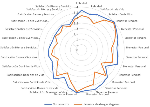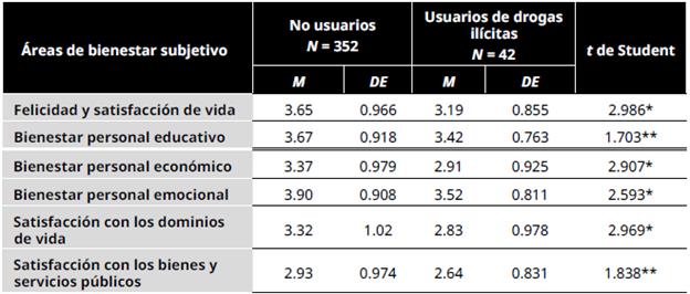 En particular, en el presente estudio sobresale que quienes usaron drogas presentaron menor bienestar subjetivo en los indicadores relacionados con la felicidad y la satisfacción con la vida, la satisfacción con los dominios de vida y el bienestar personal económico. Los dos primeros elementos están directamente asociados con la apreciación individual de la propia vida, lo cual puede figurar como factor de riesgo para el consumo en quienes muestran niveles bajos de satisfacción.