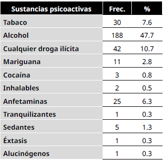 De acuerdo con lo esperado, la sustancia que registró un mayor porcentaje de consumo en los estudiantes participantes en el estudio fue el alcohol, y, contrario a lo esperado, el uso de drogas ilícitas fue ligeramente más alto que el consumo de tabaco (véase Tabla 1).