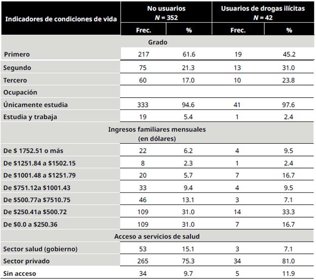 Al comparar las condiciones de vida de los estudiantes usuarios con los no usuarios de drogas ilícitas, se encontró que los usuarios cuentan con un nivel de estudios más alto (hay una mayor proporción en tercer año), en su mayoría solo se dedican a estudiar (muy pocos estudian y trabajan), cuentan con un ingreso familiar más alto, y, si bien en su mayoría cuentan con acceso a servicios de salud de forma particular, un porcentaje ligeramente más alto carece de este tipo de atención (véase Tabla 2). No obstante, las diferencias identificadas en estos indicadores entre los grupos de estudio no son estadísticamente significativas.