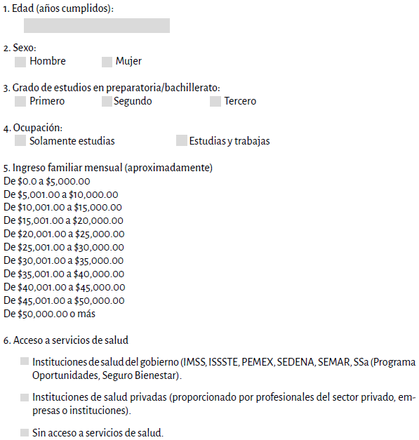 El levantamiento de información se llevó a cabo entre el segundo semestre de 2019 y el primer semestre de 2022. En la primera escuela se realizó la aplicación del instrumento de manera presencial, en donde, frente al grupo, el responsable de la aplicación explicó el objetivo de la investigación y ofreció instrucciones básicas para su llenado. Posteriormente, dado el inicio de la pandemia por COVID-19 en marzo de 2020, y bajo las medidas de distanciamiento social, para la segunda y tercera escuela se llevó a cabo la aplicación del instrumento en línea, a través de la plataforma Survey Monkey. Puesto que los estudiantes atendían de manera híbrida (presencial y virtual), los dos planteles educativos facilitaron un espacio para platicar con los jóvenes en sus aulas respecto a cómo responder el instrumento de forma virtual, y sobre el acompañamiento por Zoom para responder la encuesta.