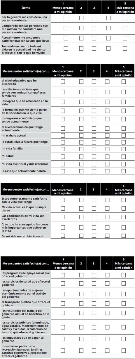 A continuación, se le presentan una serie de afirmaciones sobre la satisfacción y las condiciones de vida en que se desenvuelve. Marque la opción que más se acerque a su punto de vista. Las opciones de respuesta se presentan en una escala del 1 al 5, donde 1 es el valor que menos se acerca a su punto de vista y 5 el valor que más se acerca.