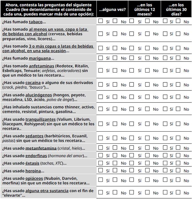 El instrumento estuvo compuesto por tres apartados: uno con información sobre características sociodemográficas, otro con una escala de bienestar subjetivo, y otro con información respecto al consumo de sustancias psicoactivas.