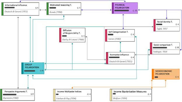 The theories associated with the types of polarization are shown in Figure 3. It shows that group polarization has the largest theoretical corpus, derived from the experimental tradition of psychology. Likewise, the explanation of socioeconomic polarization is based on the development of indicators that make it possible to measure it through parameters, both in societies and between states.