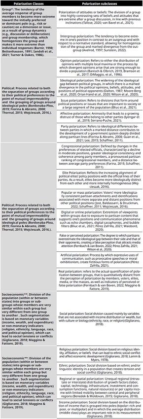 In light of the above, Table 4 consolidates the proposal for each class and subclass of polarization with the respective definitions. It should be noted that the definitions of group polarization and its subclasses emphasize group dynamics and homogenization of attitudes. The definitions of political polarization and its subclasses are characterized by three important aspects: 1. the activation of a social identity related to political ideology; 2. intergroup relations characterized by distance; and 3. homogenization of ingroup positions on political issues. Finally, definitions of socio-economic polarization focus on the construction of indicators and measurements of monetary and non-monetary aspects.