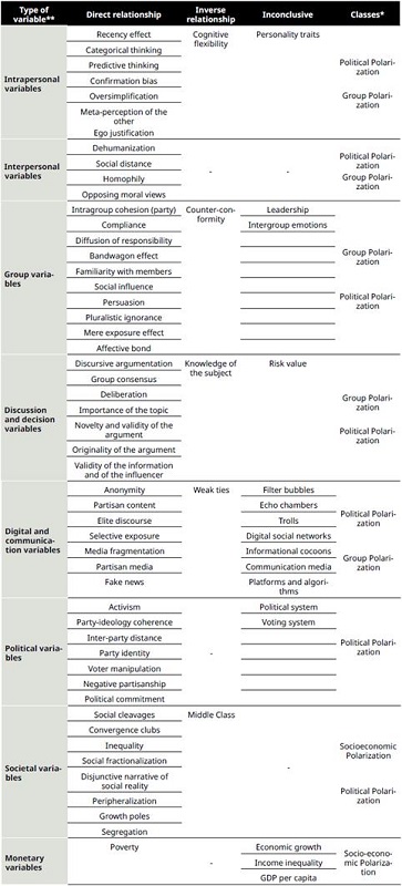 72 variables have been identified as related to polarization. Of these, 51 are variables that have a direct relationship with the phenomenon, that is, they increase polarization. Five variables have an inverse relationship with polarization and 16 are inconclusive. Table 5 shows the variables grouped into eight types, according to their nature. It also refers to the type of polarization with which they are associated.