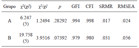 Se realizó un análisis factorial confirmatorio con el grupo A y otro con el grupo B. Los parámetros del modelo se estimaron siguiendo el modelo de Máxima Verosimilitud. Los 5 ítems de la escala se agruparon en una sola variable latente, puesto que los datos basados en cuestionaros tipo Likert pueden aparecer en distribuciones que no se ajusten a la ley normal, y se utilizó el método de distribución ML-Robusto. Se emplearon los siguientes indicadores de bondad de ajuste: S – Bχ2 = χ2 escalado de Satorra-Bentler dividido por grados de libertad (valores ≤ 5.0 y valores de S – Bχ2 no significativos indican buen ajuste del modelo); GFI = LISREL goodness of fit index; CFI = comparative fit index (valores ≥ .90 señalan buen ajuste); SRMR = standardized root mean square residual (valores ≤ .08 indican buen ajuste); RMSEA = root mean square error of approximation (valores ≤ .06 indican buen ajuste). Los resultados obtenidos sugieren una bondad de ajuste adecuada para el modelo de un solo factor (tabla 1).