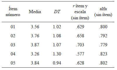 La puntuación media para cada ítem osciló entre 3.26 (ítem 4) y 3.87 (ítem 3), y los valores de las desviaciones estándar para cada ítem estuvieron alrededor de 1. El rango de correlaciones de cada uno de los ítems con la puntuación total corregida (eliminado el propio ítem) fue elevada, estuvo por encima de .6 en los 5 reactivos. También se observó que al eliminar cualquiera de los ítems el valor del alfa de Cronbach de la escala total disminuía considerablemente (tabla 2).