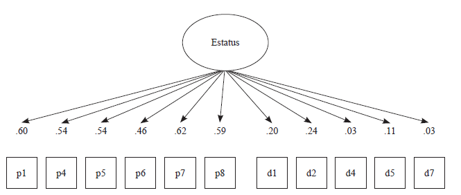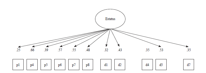 En primer lugar se procedió a aplicar el análisis confirmatorio en la muestra española. Un primer modelo, o modelo unidimensional, hizo depender todas las variables observadas de un solo factor latente o concepto denominado estatus, tal y como se representa en la figura 1. Los resultados de los índices de bondad de ajuste para este primer modelo se presentan en la tabla 4.