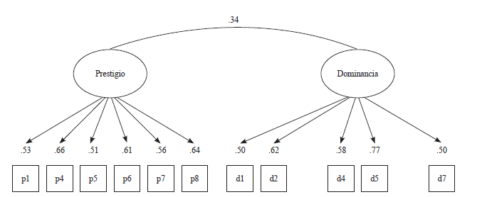 Posteriormente se evaluó el modelo bidimensional restricto en la muestra española. En este se hicieron depender los ítems de dos factores latentes; los ítems que se propusieron como vinculados a la búsqueda de prestigio cultural se hicieron depender de un factor que se etiquetó como prestigio y los ítems que se propusieron como vinculados a la búsqueda de estatus por dominancia se hicieron depender de un factor que se etiquetó precisamente como dominancia. Para el caso de la muestra española, en el modelo bidimensional restricto se conectaron también los dos factores latentes por medio de un sendero. Los resultados se presentan en la figura 2 y la tabla 5. Puede observarse cómo se obtuvieron relativos mejores indicadores de ajuste en comparación con el modelo unidimensional, aunque estos no estuvieron dentro de los márgenes idóneos.