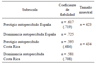 La medición de prestigio autopercibido obtuvo una baja fiabilidad en la muestra española, debido a que dos ítems (3 y 5) correlacionaron muy bajo con el resto de la subescala. Exactamente el mismo fenómeno ocurrió en la muestra costarricense, donde también los mismos dos ítems afectaron la fiabilidad de la medición. Al retirar estos ítems, la subescala de prestigio alcanzó el mínimo de fiabilidad aceptable (coeficiente α = .719) en la muestra española pero no así en la muestra de Costa Rica (coeficiente α = .684) por lo que en el caso de esta última fue necesario realizar el análisis de datos partiendo de una fiabilidad levemente menor que la inicialmente propuesta.
