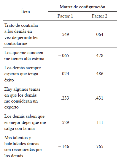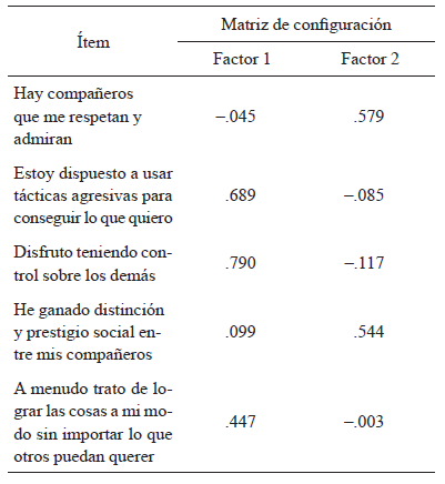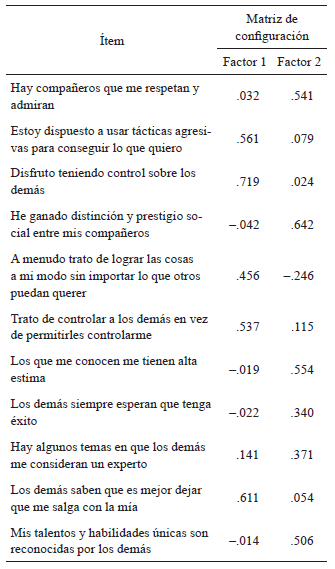 El análisis paralelo indicó que debían mantenerse dos factores, los mismos concentraron el 43.41% de la varianza explicada. El primer factor representó un 26.56% y el segundo factor contribuyó con un 16.85%. Los resultados de la rotación se presentan en la tabla 2. Puede observarse como el primer factor concentró los ítems referidos a la dominancia, y el segundo, los correspondientes al prestigio.