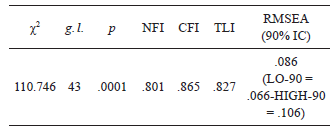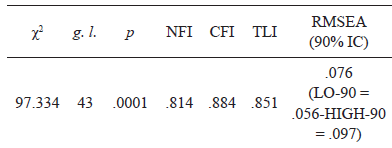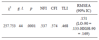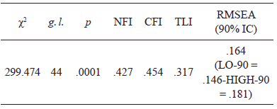 Como puede observarse, los índices de bondad de ajuste obtuvieron valores que indican que el modelo se ajustó pobremente al comportamiento de los datos. Ni el índice χ2, ni los índices NFI, CFI, TLI, ni el índice RMSEA, obtuvieron valores ubicados dentro de los rangos que indican un adecuado ajuste del modelo a los datos.