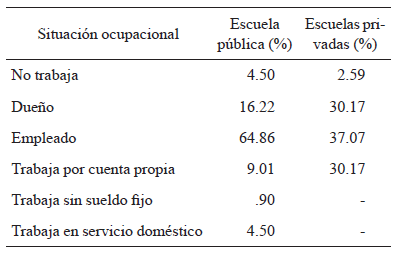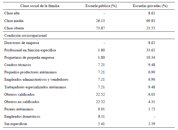 Debido a la existencia, ya mencionada, de diferencias marcadas en el nivel socioeconómico de los alumnos que asisten a escuelas privadas y de los que concurren al sistema público de enseñanza en Argentina (DiNIECE, 2009), se consideró el tipo de escuela como un indicador del NSEC de los participantes. Al respecto, Rosselli et al. (2006) señalan que los variados factores ambientales complejos asociados con asistir a una escuela pública o a una escuela privada, como el nivel de escolaridad de los padres, influyen en el desempeño en pruebas de lectura. Para profundizar en la estimación del NSEC de los estudiantes se recabó información sobre la clase social, la condición sociocupacional del jefe/a de familia, el nivel educativo de los padres y la situación ocupacional actual del jefe/a de familia de los participantes (véase Torrado, 1992), y se encontraron claras diferencias entre los usuarios del sistema público y los del sistema privado en todas las dimensiones analizadas. Estas diferencias se sintetizan en un mayor porcentaje de familias de clase social baja, junto con un menor nivel educativo alcanzado por los padres o encargados de los alumnos, en la escuela de gestión pública.