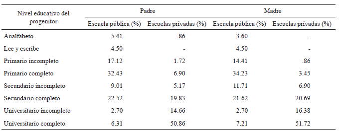 Con respecto al NSEC de los estudiantes, se hallaron diferenciasclaras en todas las dimensiones: en cuanto a la clase social, el 70% de lasfamilias que envía a sus hijos a las escuelas de gestión privada pertenece a laclase media y poco más del 25% de los sujetos que asisten a la escuela públicaseleccionada pertenece a esa categoría; más de un 70% de los alumnos de esaescuela pertenece a familias de clase obrera, en tanto en las escuelas privadasese segmento solo representa un 21%. Acerca del nivel educativo, menos de un10% de los padres de los alumnos de la escuela pública ha asistido a launiversidad y casi un 60% no ha asistido al secundario; en las escuelasprivadas, en cambio, el 66% de los padres de los alumnos ha asistido a la universidady más del 50% ha obtenido un título. Se halla el mismo patrón en el caso de lasmadres de los estudiantes (tablas 1, 2 y 3).