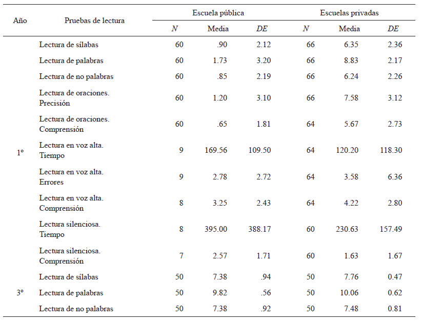 Respecto de las diferencias entre los alumnos de tercer año, se observa que los de las escuelas privadas presentaron un rendimiento significativamente superior en las pruebas de lectura de sílabas y palabras, y en las de comprensión lectora de oraciones y de lectura en voz alta. Asimismo, se identifican diferencias significativas en el tiempo y en los errores de lectura en voz alta, y en el tiempo de lectura silenciosa. Sin embargo, las diferencias no resultan significativas en la lectura de no palabras, la precisión en la lectura de oraciones y la comprensión en la lectura silenciosa de un texto.