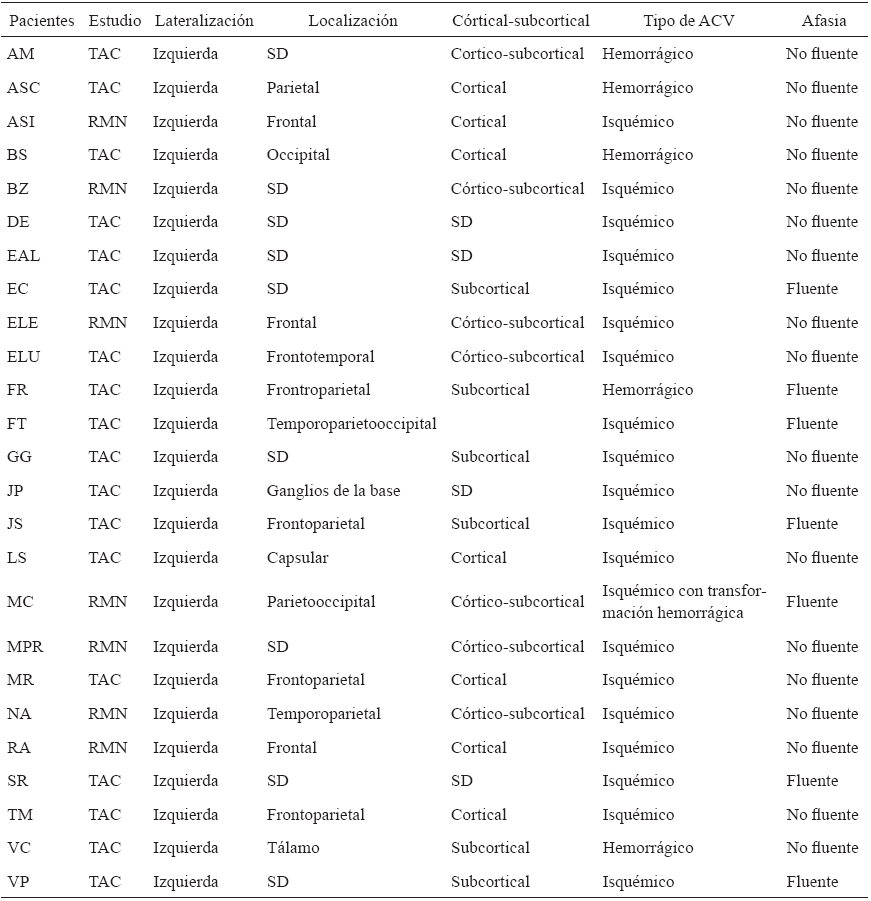 Se evaluaron 25 pacientes con afasia que habían sufrido un accidente cerebro-vascular (ACV) atendidos en el Hospital Privado de Comunidad (HPC) y el Hospital Interzonal General de Agudos (HIGA) Oscar Alende, de la ciudad de Mar del Plata (Argentina). Los pacientes participaron de forma voluntaria en el estudio con consentimiento informado. Este estudio, así como el formulario de consentimiento informado, fue aprobado por el Comité de Ética del Comité Institucional de Revisión de Estudios de Investigación del HPC y el Comité de Investigación del HIGA. Este estudio se realizó siguiendo las normas éticas establecidas en la Declaración de Helsinki. Los criterios de inclusión para los pacientes fueron: (a) haber sufrido una lesión cerebral focal como consecuencia de un ACV; (b) estar orientado en tiempo, espacio y persona; (c) no estar sometidos a respiración artificial; (d) no poseer indicios de diagnóstico clínico de demencia o déficit cognitivo previo de acuerdo con la evaluación del neurólogo y los datos de la historia clínica; (e) no poseer historia previa de diagnóstico de afectación psicopatológica relevante o parcialmente incapacitante; (f) tener visión normal o corregida a normal, y (g) comprender órdenes simples. La presencia de afasia severa fue criterio de exclusión.