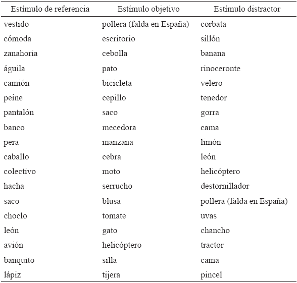 Tarea de relaciones taxonómicas verbal y pictórica. Esta prueba se elaboró en un trabajo previo (Vivas, 2012) con la finalidad de obtener una medida del reconocimiento de las relaciones taxonómicas siguiendo el formato de presentación y la consigna de la prueba de Pirámides y Palmeras. Las tríadas estuvieron conformadas por palabras o dibujos pertenecientes a la misma categoría semántica, pero con distinta proximidad. Por ejemplo, dentro de la misma categoría semántica águila y pato tienen mayor proximidad que águila y rinoceronte. Quedaron conformados en la versión final 18 ítems (véase el apéndice 2) y se obtuvo un número de ítems equivalente entre la prueba de Pirámides y Faraones y la tarea de relaciones taxonómicas. Se escogió el mismo número de ítems para cada categoría semántica. La consigna solicitaba responder con cuál de los dos ítems de abajo se asocia más el de arriba. Esta consigna es la misma que la utilizada en la versión argentina de la prueba de Pirámides y Faraones. La tarea se administró mediante el Presentation Software.