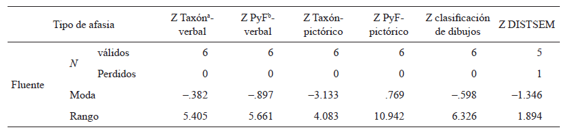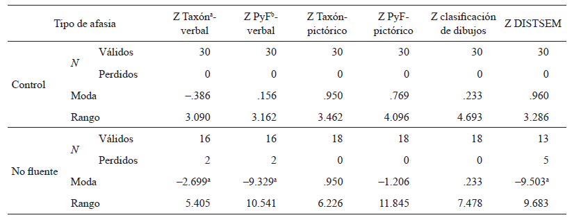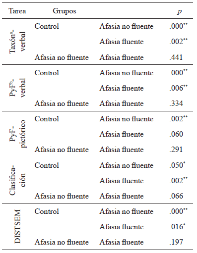 Los pacientes con afasia no fluente presentaron diferencias altamente significativas con el grupo control en todas las tareas menos en Clasificación de Dibujos, donde hubo una diferencia con un nivel de significación más moderado (p < .05). Por su parte, el grupo de pacientes con afasia fluente presentó diferencias altamente significativas con el grupo control en la tarea verbal de relaciones taxonómicas, la tarea verbal de relaciones temáticas y Clasificación de Dibujos y una diferencia significativa pero más moderada en la tarea de estimación de distancias semánticas (DISTSEM) y sin diferencias significativas en la tarea pictórica de relaciones temáticas.