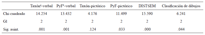 Se puede observar que los grupos presentaron diferencias significativas en todas las tareas, menos en la tarea de relaciones taxonómicas por vía pictórica. En la tabla 4 se observan los valores de p obtenidos para cada par de grupos de acuerdo con el análisis post hoc.