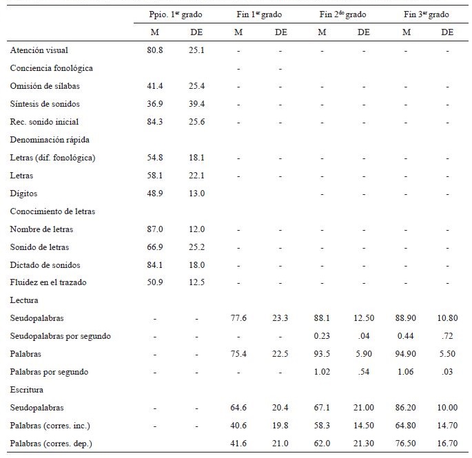 Las autoras de este trabajo evaluaron a los niños a principio de primer grado y a fin de primero, segundo y tercer grados. La prueba de dictado de sonidos constituyó una excepción, ya que fue administrada solo por la primera autora del trabajo.