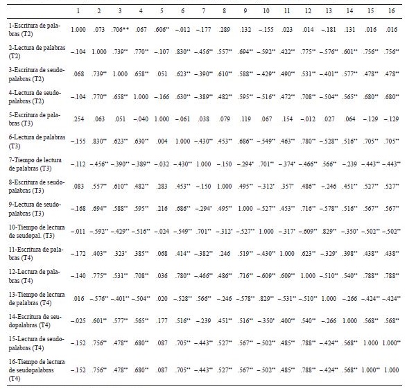 Con el fin de analizar las relaciones entre diferentes tareas (lectura y escritura de palabras y seudopalabras) entre sí, y de intentar inferir el tipo de procesamiento al que se accede en cada caso (fonológico a través de la lectura y escritura de seudopalabras y ortográfico a través de la lectura y escritura de palabras ortográficamente complejas), hecho que resulta de importancia para el análisis del desarrollo de la escritura y la lectura de palabras ortográficamente complejas, se calcularon correlaciones bivariadas (Rho de Spearman, dado que se incluyen medias que se alejaron significativamente de la distribución normal asintótica) entre las distintas pruebas de lectura y escritura administradas (véase tabla 2).