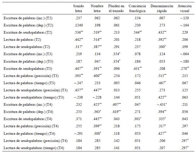 Vale aclarar que la falta de correlaciones entre las medidas de escritura de palabras con correspondencias inconsistentes y dependientes del contexto de fin de primer grado y las habilidades predictoras puede deberse a que, habiendo disociado las puntuaciones del total de la prueba y al ser menor el número de palabras en cada categoría (correspondencias inconsistentes y dependientes del contexto) se pierde la fuerza de las correlaciones. El hecho de que la puntuación del total de la prueba de escritura haya obtenido importantes correlaciones con las medidas de las habilidades predictoras da cuenta de este hecho (r = .555 y p = .001, escritura y conocimiento del nombre de las letras; r = .472 y p = .001, escritura y conocimiento del sonido de las letras; r = .597 y p = .001, escritura y conciencia fonológica, y r = .444 y p = .001, escritura y denominación rápida).
